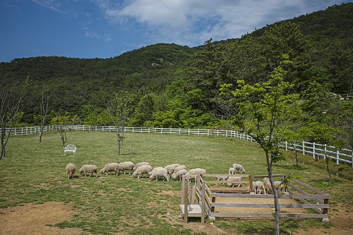 가평양떼목장카페는 끝이 보이지 않는 산과 대자연, 6만평초지에 사람과 공존하는 정갈하고 아름다운 카페이다. 양 먹이주기 체험 등 이색적인 체험을 하며 힐링할 수 있는 곳이다.풀 뜯는 양들을 바라보며 커피 한 잔의 여유를 즐길 수 있는 베이커리 카페. 정문에서 입장권 겸 건초 체험권(6,000원)을 구매해야 들어갈 수 있다. 목장은 잣나무 숲에 둘러싸인 6만 평 규모의 초지다. 언덕 위쪽은 카페, 아래쪽은 30여 마리의 양 떼가 방목된 목장이다. 세 채의 카페 건물은 구불구불한 회랑으로 전부 이어져 있으며, 통유리를 통해 양 떼와 광활한 목장 풍경을 사각지대 없이 감상할 수 있다. (자료출처 : 대한민국 구석구석 - korean.visitkorea.or.kr) 위치 : 펜션에서 차량으로 약 33분, 22.1km